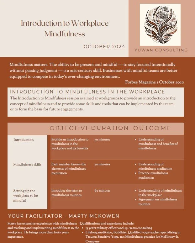 The Introduction to Mindfulness is a three-hour session aimed at introducing workgroups to the concept of mindfulness and providing some skills and tools that can be implemented by the team or that will form the basis for future engagements.